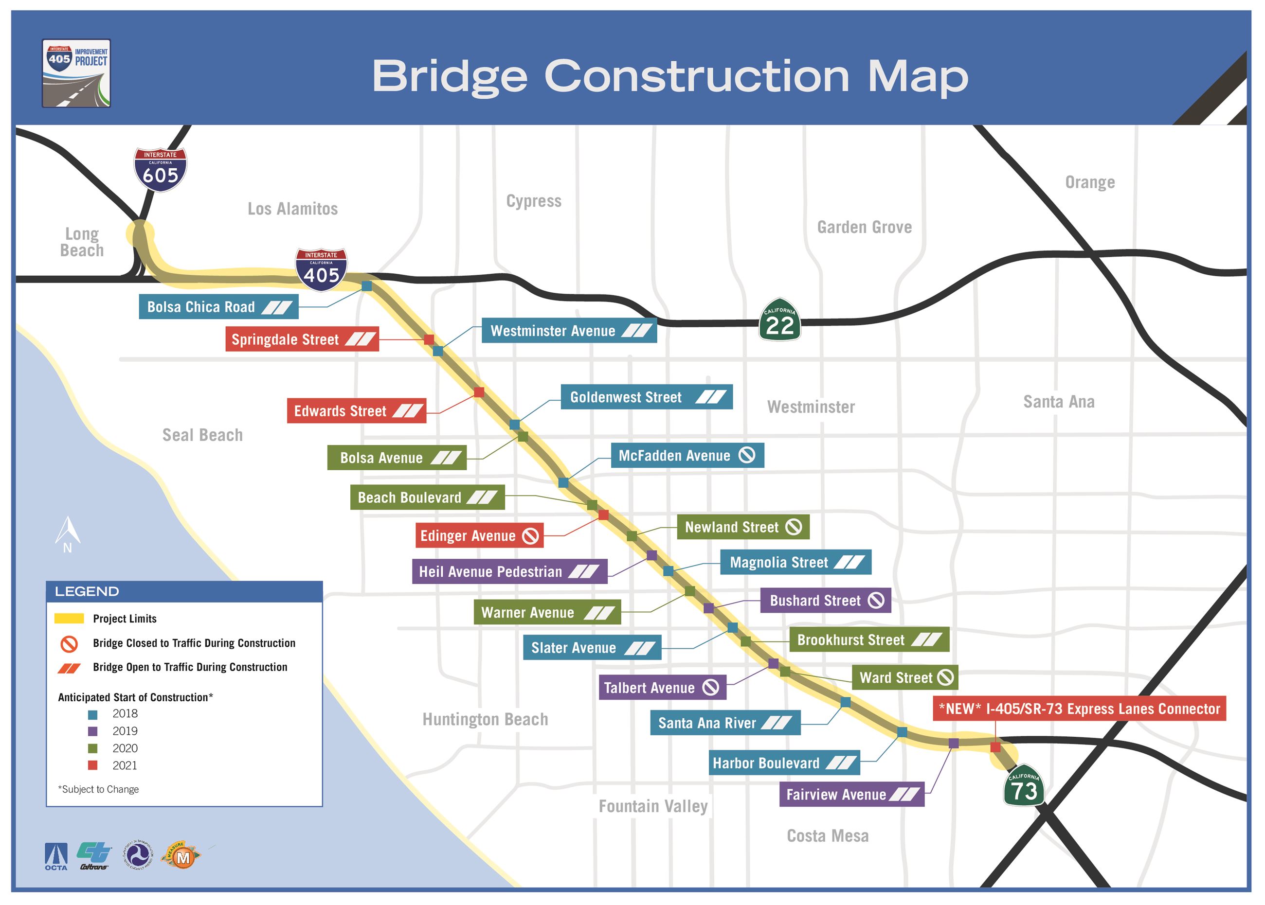 OCTA recently released a preliminary bridge construction map showing when construction is anticipated to start on the bridges affected by the I-405 Improvement Project and which bridges will be closed during construction. (Click on the map to the right to enlarge the image.)